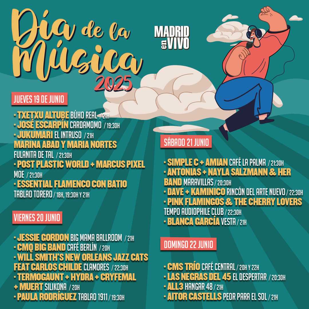 Del jueves 19 al domingo 22 de junio, 20 salas de Madrid se unirán para celebrar el DÍA DE LA MÚSICA 2025, con la máxima expresión de la música, la música en directo