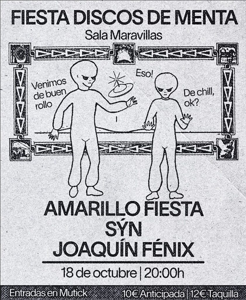 El sello Discos de Menta celebra su segunda fiesta el 18 de octubre en Madrid, y lo hará de nuevo en la sala Maravillas, esta vez con las actuaciones de tres de sus bandas: SYN, Amarillo Fiesta y Joaquín Fénix.